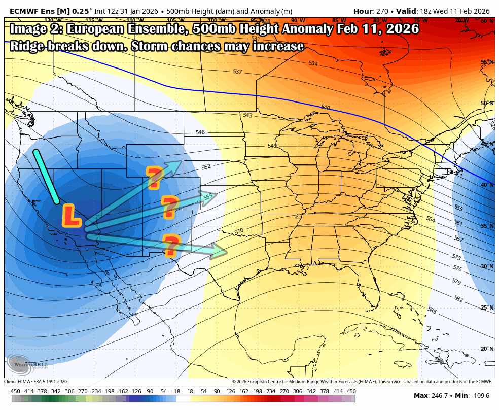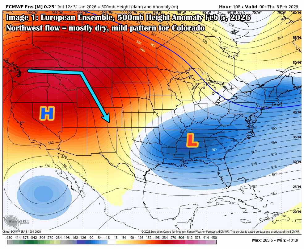 The 500mb height anomaly map below (from the 12z Jan 31 ECMWF ensemble) shows a strong high-amplitude ridge over the Pacific Northwest, locking in through the first third of February. This is a classic northwest flow regime for Colorado, and overall, not a favorable setup for significant snow along the I-25 corridor or plains.