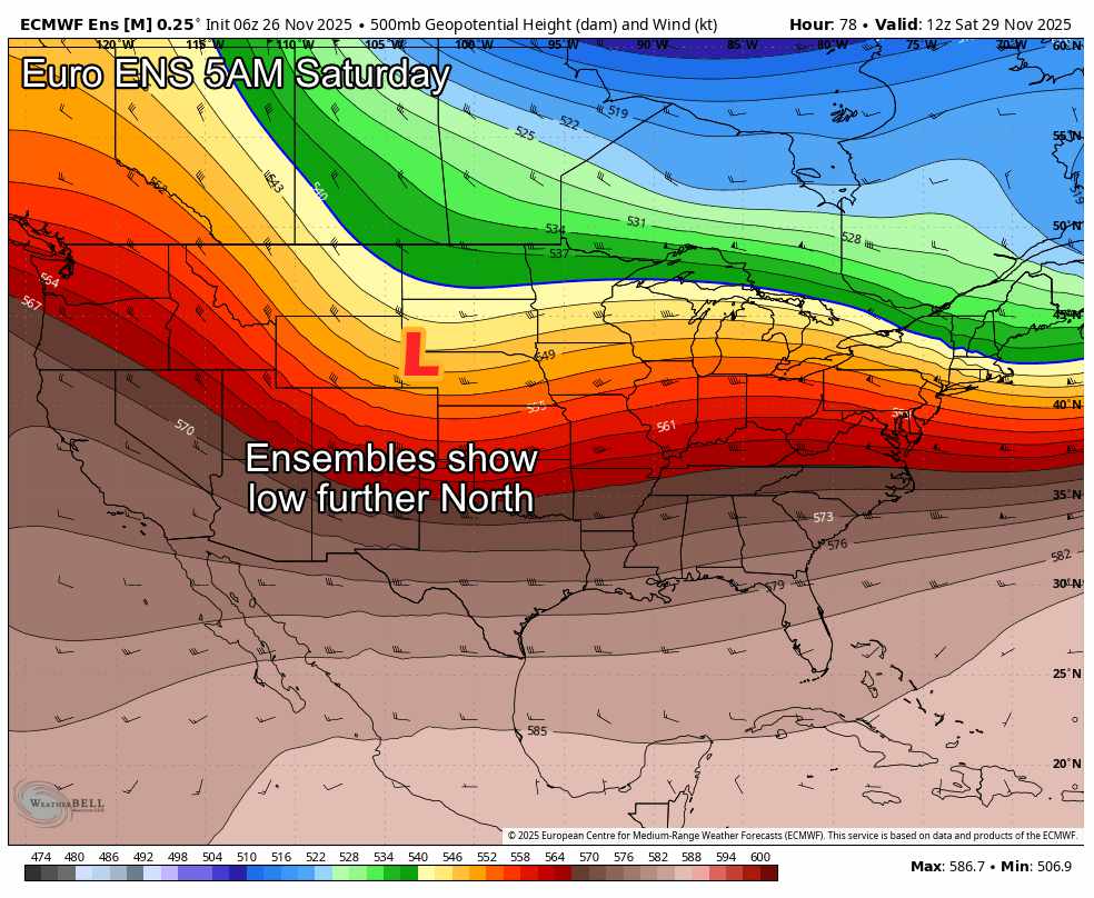 This storm system is showing the same characteristics. This is all pretty typical of late fall/early winter La Nina setups, the jet stream tends to stick further to the North, meaning we just don’t get the big storm systems. The Euro Deterministic above shows the low and I’ve added the track.