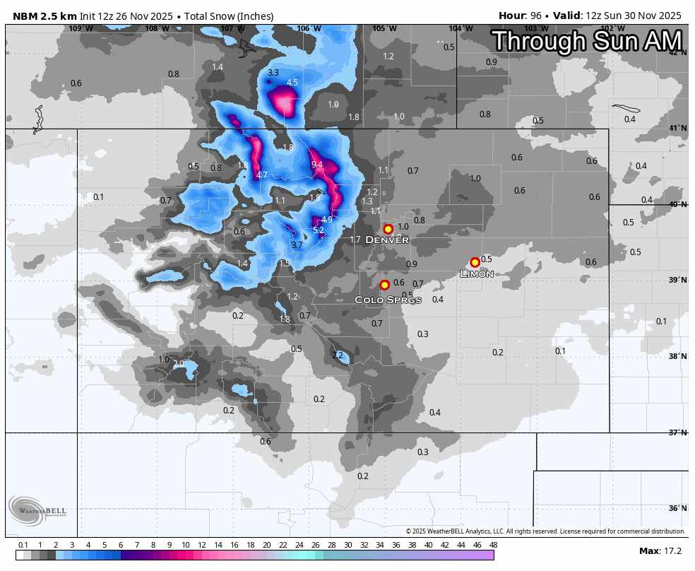We’re watching this closely because even light snow on cold pavement can make for slick conditions, particularly bridges, overpasses, and shady spots. Be heads-up if you’re driving back into the Front Range late Sunday.